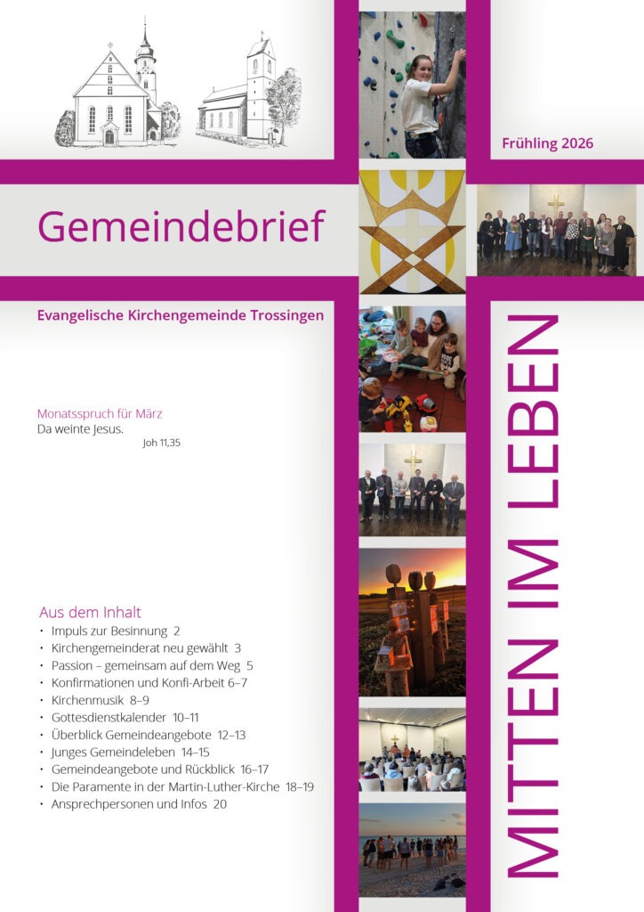 Unser Gemeindebrief informiert Sie vier mal im Jahr mit interessanten Artikeln und informiert Sie über Neuigkeiten, aktuelle Meldungen und Wissenswertes aus unserem Gemeindeleben.